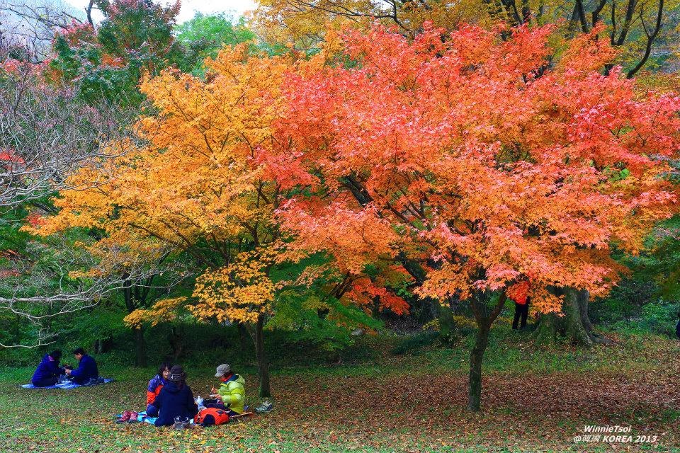 內藏山被喻為韓國第一楓葉山,無論是韓國人還是海外遊客,皆會紛紛到當地賞楓。韓國氣象廳預測今年2013年內藏山會於10月21日踏入楓葉期,即指楓葉染紅佔山的面積達20%。並約於11月6日為全盛期,指楓葉盛放面積達80%。然而預測只能作參考之用,不能盡信啦!始終樹葉何時轉色還是取於天氣,氣溫需下降至某個度數才會轉色,多雨大風的話楓葉亦容易被吹落呢!楓葉觀賞期大約維持兩至三個星期,首先會在山頂見到,其後才到山腳。所以如果見到山頂有,山腳可能就未轉色;山腳見到時,山頂的葉可能已經掉落呢!以下是內藏山的景況。希望大家也可以欣賞到美麗的楓葉啦!