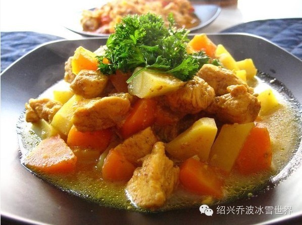4. 鍋內加底油,放入蔥段、薑片煸炒出香味,再放入咖哩粉稍微煸一下,之後放入雞湯、料酒、鹽、味精、雞肉,用小火燒;