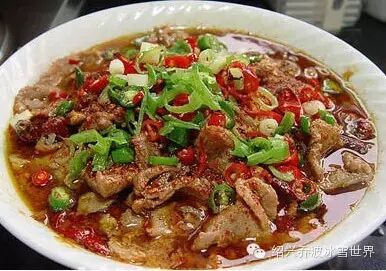 4 、把肉片滑入鍋中的水中,撥散開,斷生後撈起來放在剛才的菜上面,鍋中的湯也倒入碗中,不要太少,以不要莫過肉片為準。
