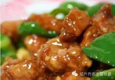 ( 4 )大勺少留底油,下蔥、姜、蒜、黃瓜片、冬筍片炒幾下,放炸好的肉段,再把對好的汁鹵潑入勺內,顛翻幾個個,滴香油出勺裝盤