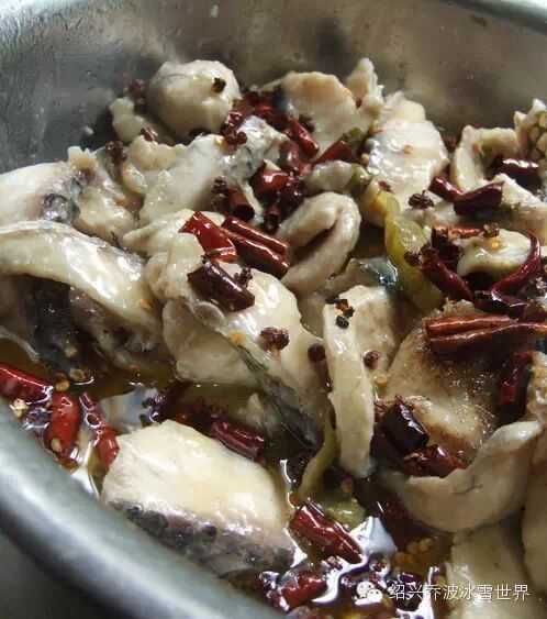 8 、魚片煮熟就連湯倒到酸菜墊底的盤子。用猛油爆香辣椒乾後淋到魚身上即可