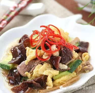將雞蛋打入碗中,加精鹽攪拌,在油鍋中炒熟雞蛋。鍋內再加豬油,蔥末熗鍋,放入肉絲煸炒,放入料酒,醬油,味精,隨後放入雞蛋,木耳翻炒即可