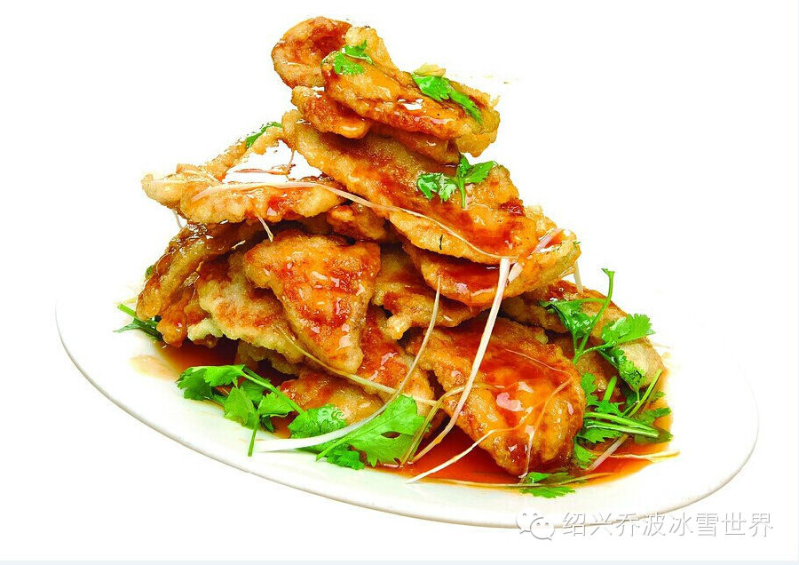1. 豬里脊肉改刀成 7 厘米長、 5 厘米寬、 0.2 厘米厚的大片,用精鹽、料酒拌勻碼味;用水澱粉及少許色拉油調成稠糊;另用醬油、白糖、醋、味精、鮮湯、水澱粉等對成滋汁。